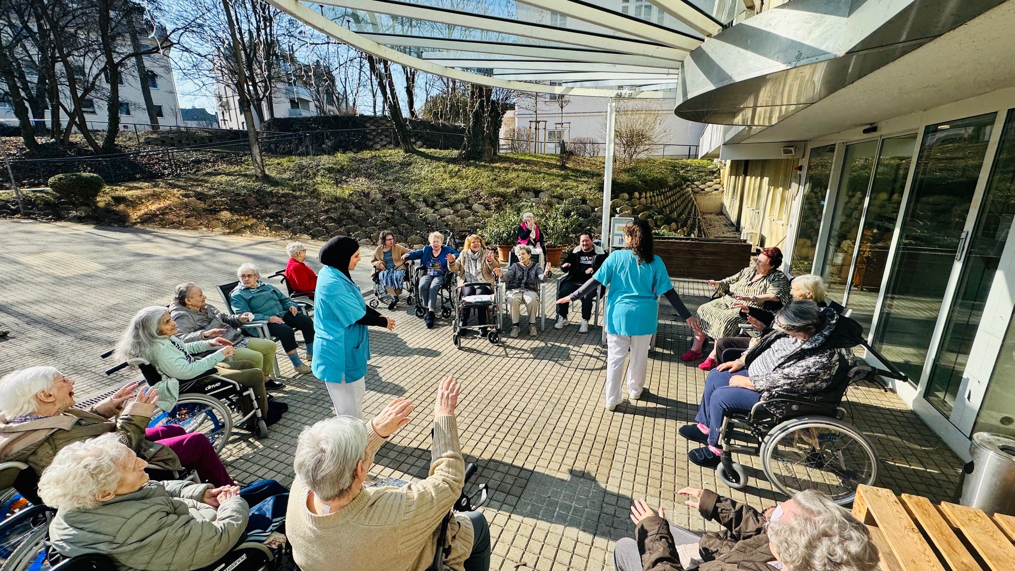 Bei schönem Wetter fand kürzlich eine Bewegungsrunde im Garten der SeneCura Residenz Oberdöbling statt. Gemeinsam mit unseren Praktikantinnen nutzten die Bewohner:innen die frische Luft, um sich sanft zu bewegen und die Sonne zu genießen.